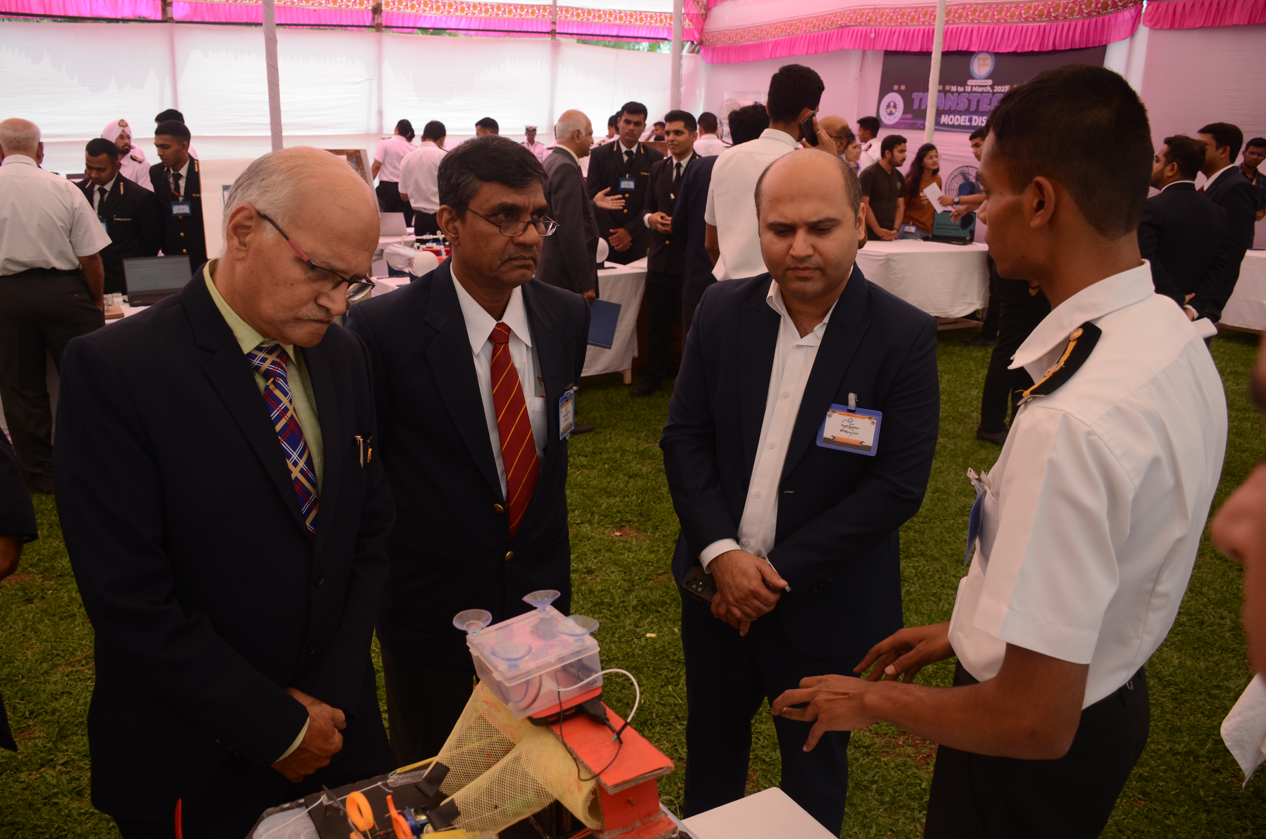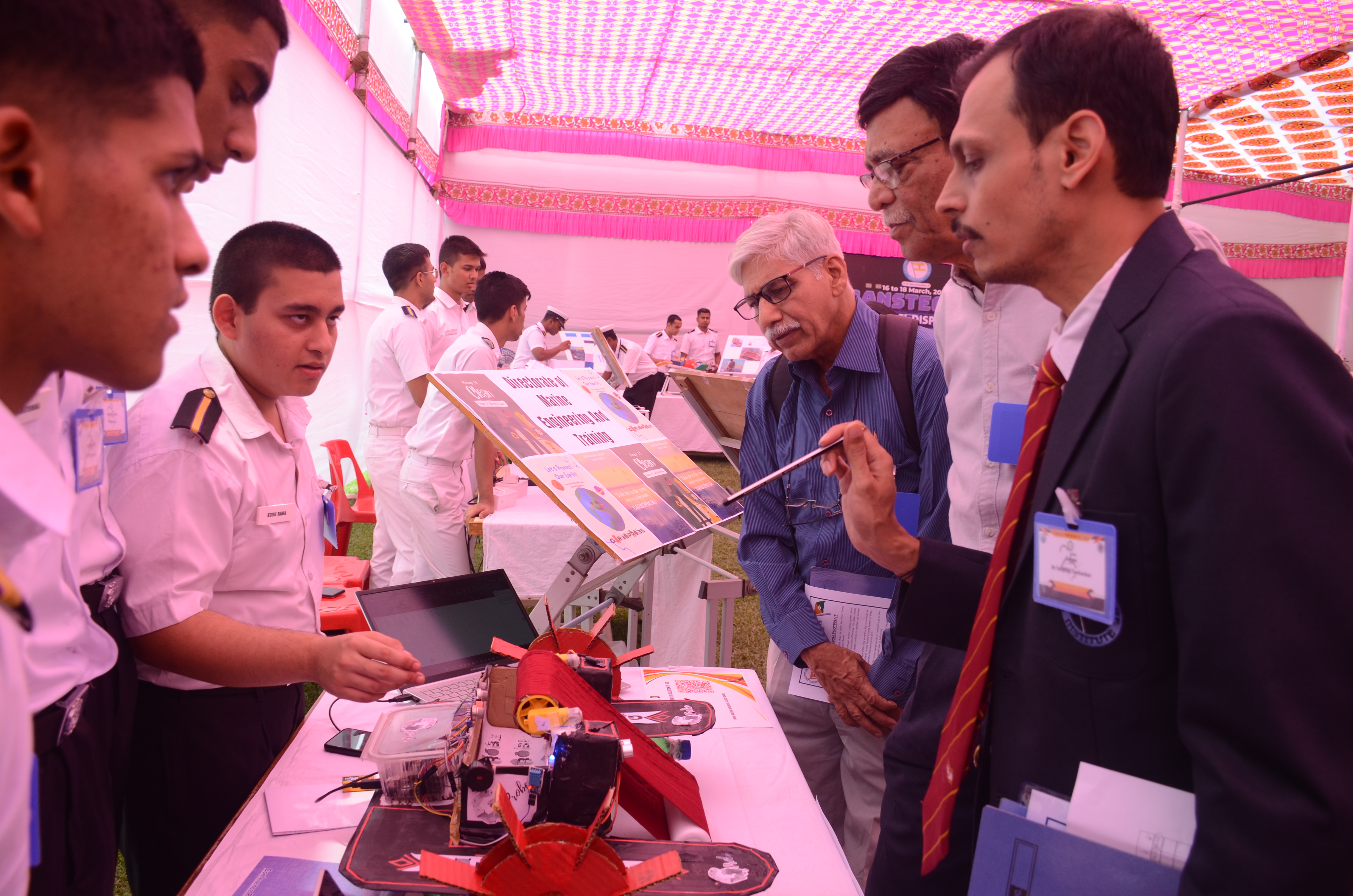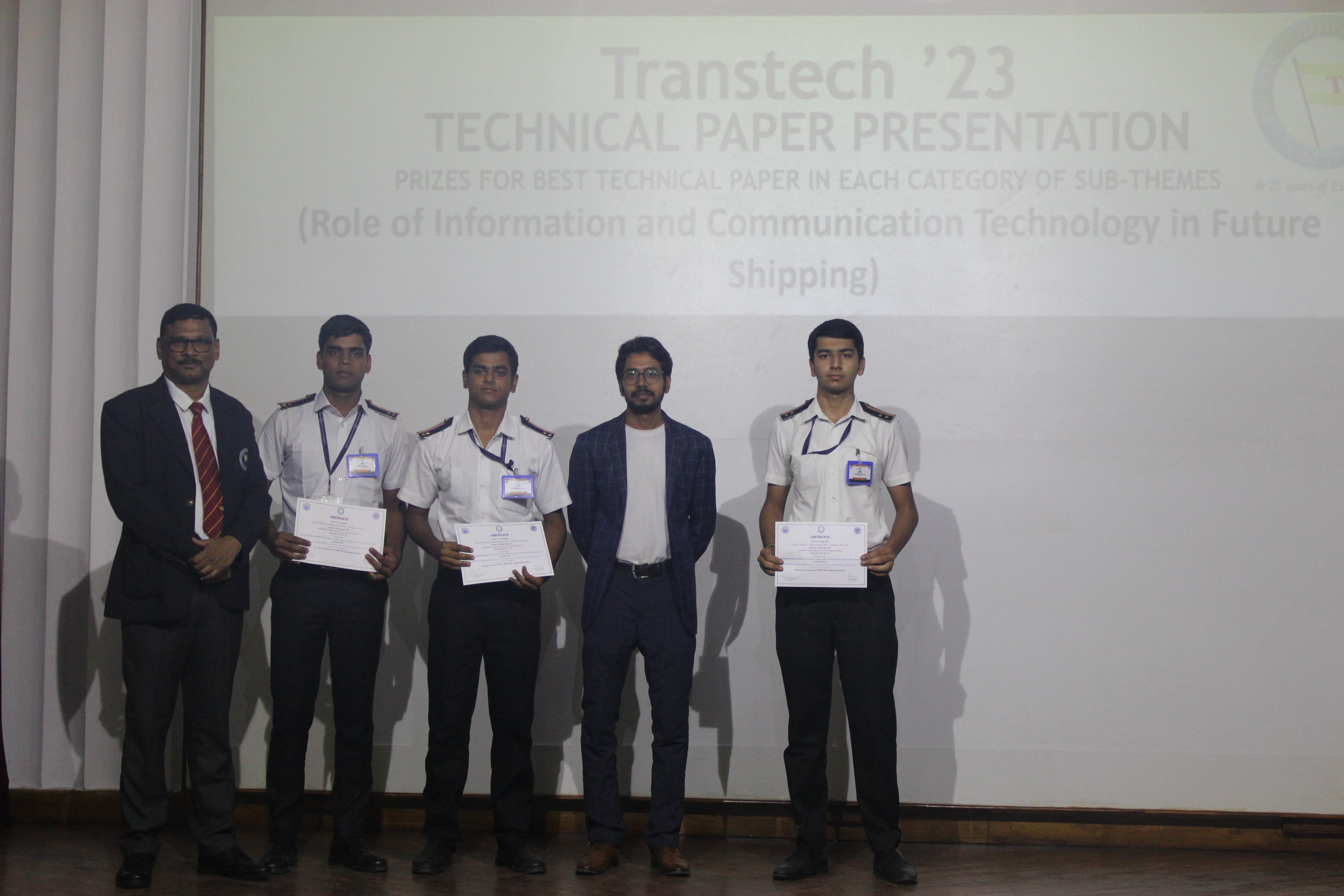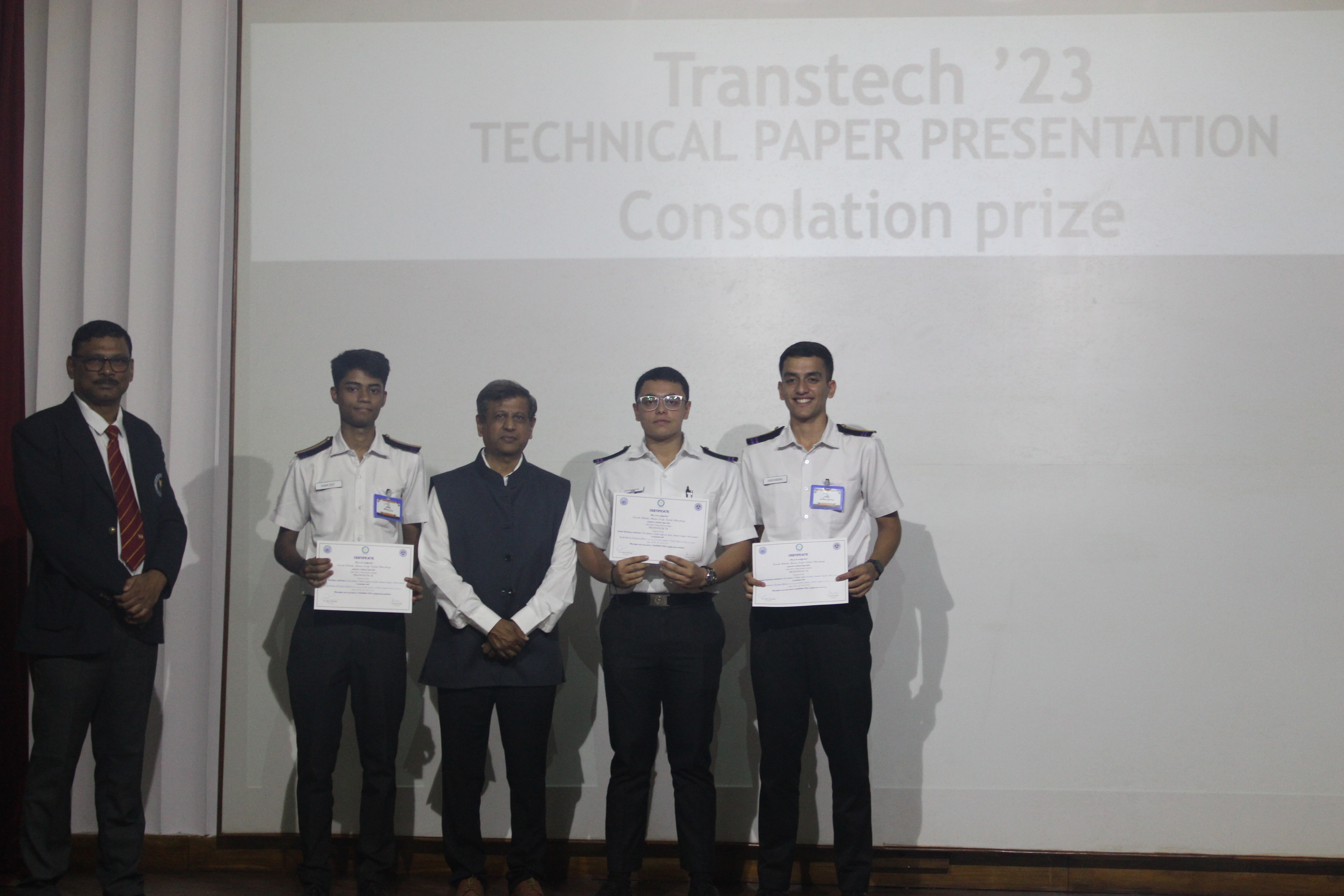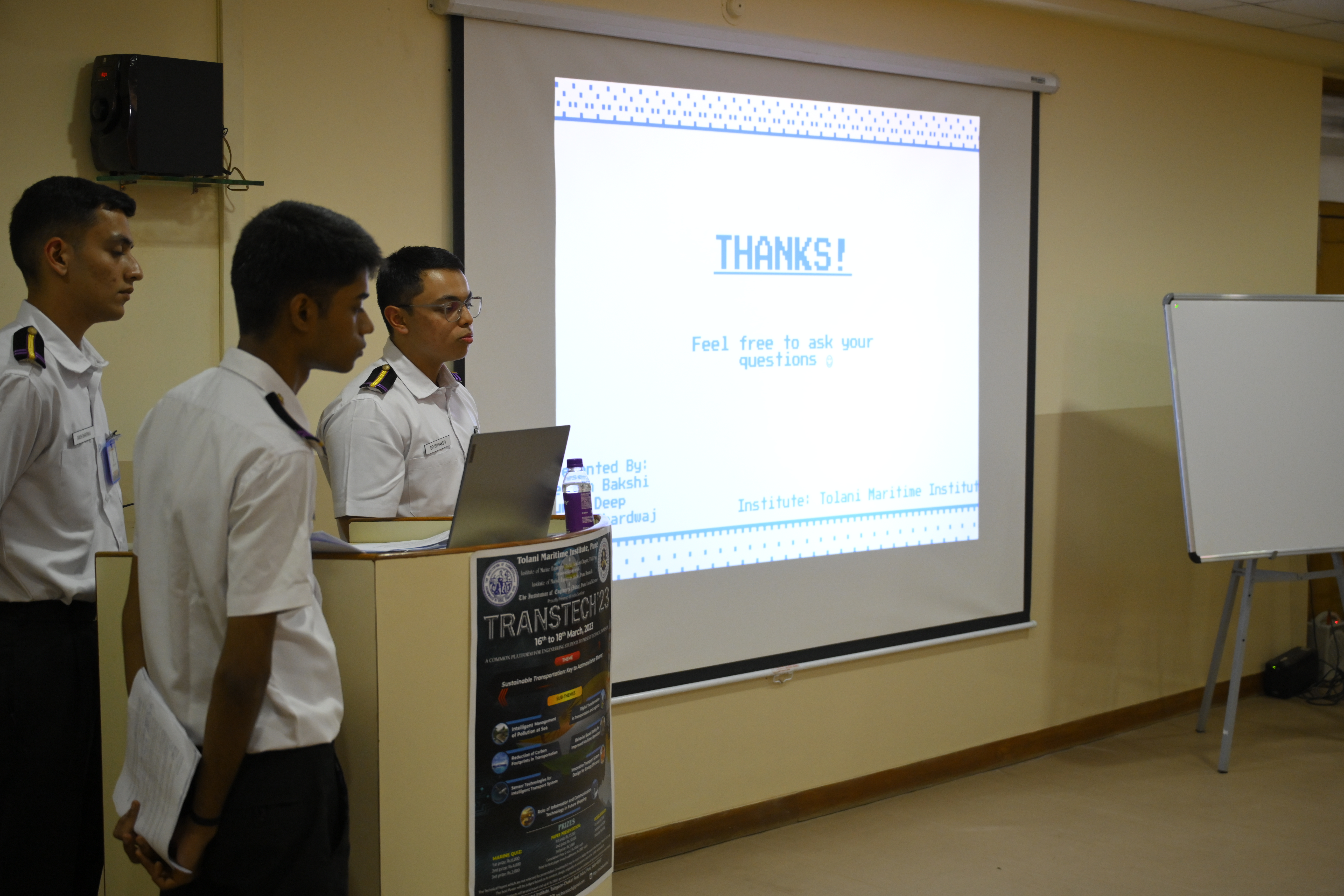 The Transtech Theme Poster winners were Cdt. Darshan Patidar and Cdt. Akshay Havaler. The wonders of their graphics and photography skills were being aired on all the three days as Cdt. Harsh Sharma and Cdt. Samarth Jogi won the Transtech Video Making Competition. The winners of the intelligence-testing Marine Quiz were Cdts. Gautam Saxena and Akshay Havaler from Tolani Maritime Institute, followed by Cdts. Abdul Gaffar and Don Baby from Anglo Eastern Maritime Academy in the second place and Cdts. Kumar Srivathsan and Dhanraj Deshpande from Hindustan Institute of Maritime Training in the third. A total of 21 entries were registered for the model making competition. The winner of Model Making Competition was Cdt. Bhavesh Kumar Sendh from Tolani Maritime Institute with his model on Cargo Hold Cleaning Robot. This was followed by models by other teams of TMI and Anglo Eastern Maritime Academy. Out of the 22 potential entries, the winner of the Poster Making Competition was Cdt. Devendraraj Chavan from IMU Vishakhapatnam for his poster on, "A Socio-Economic Solution for Inland Water Transportation".