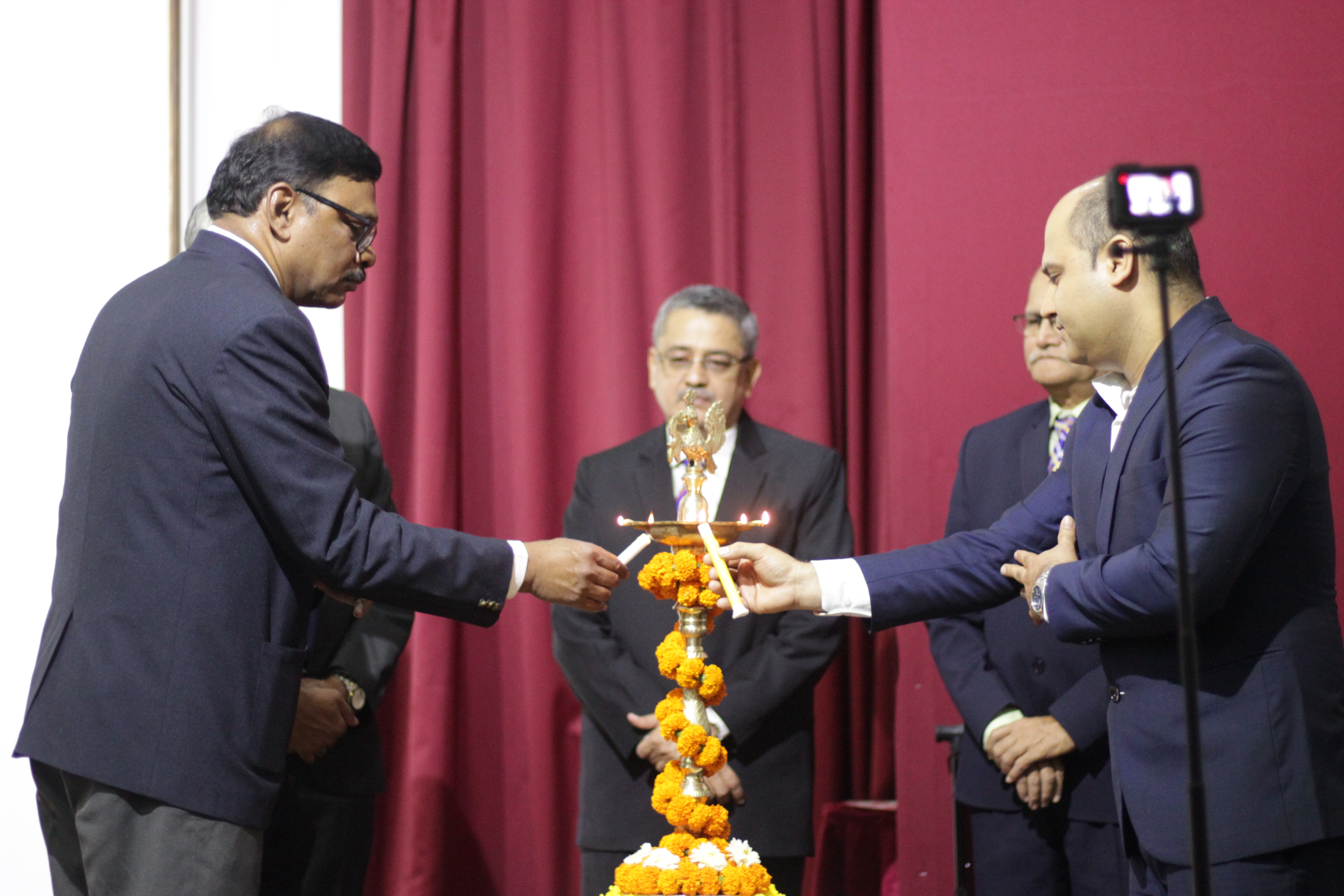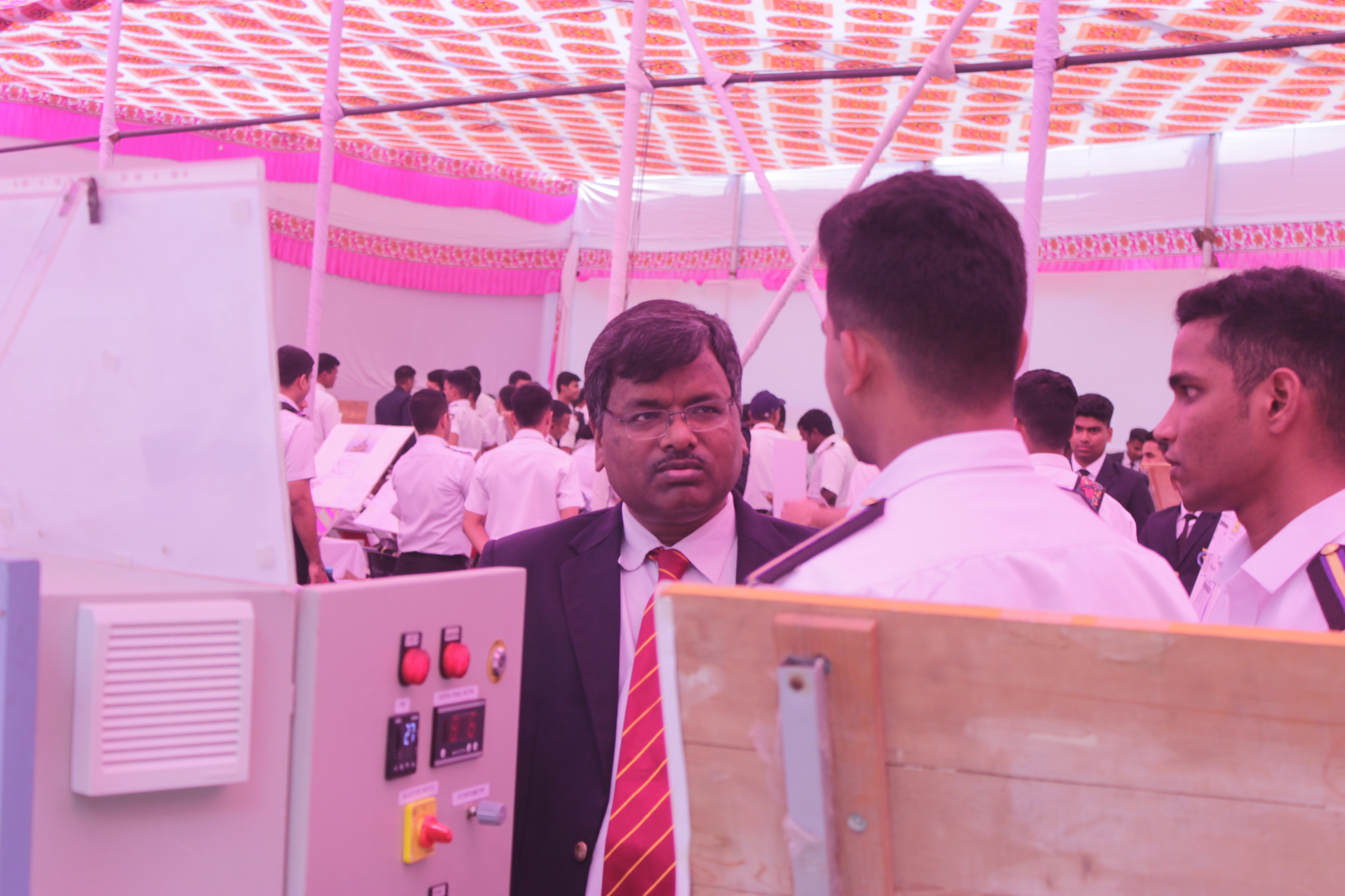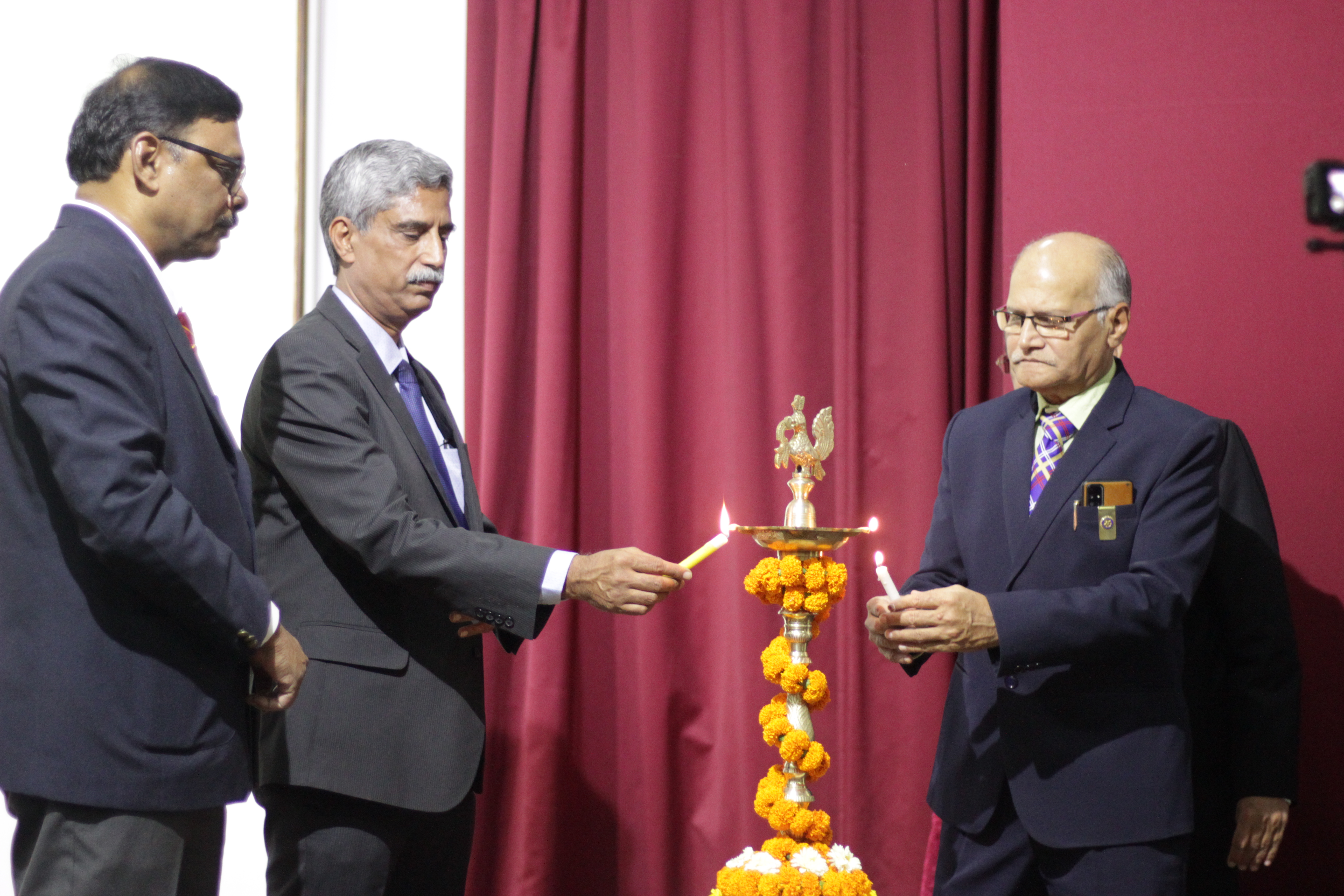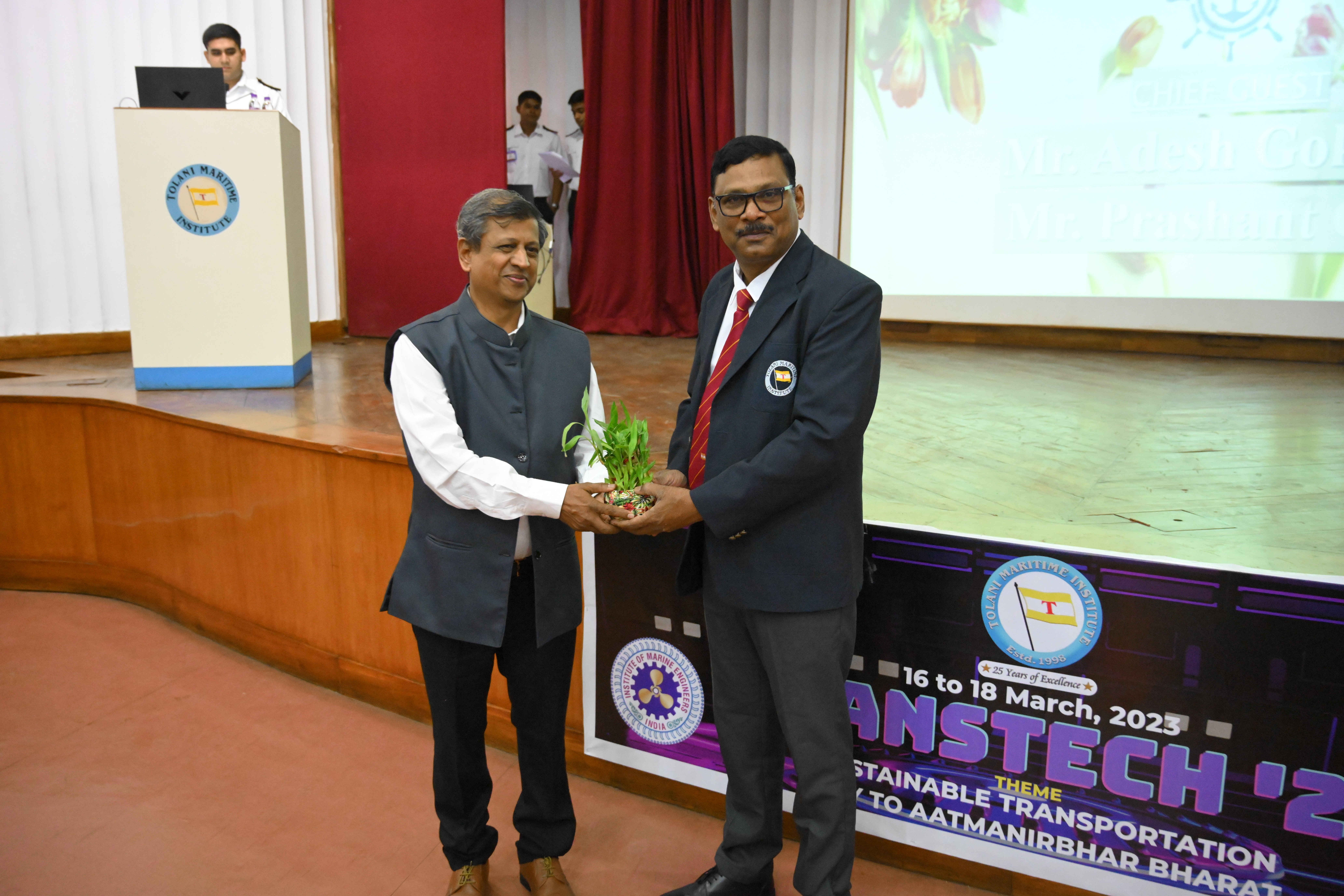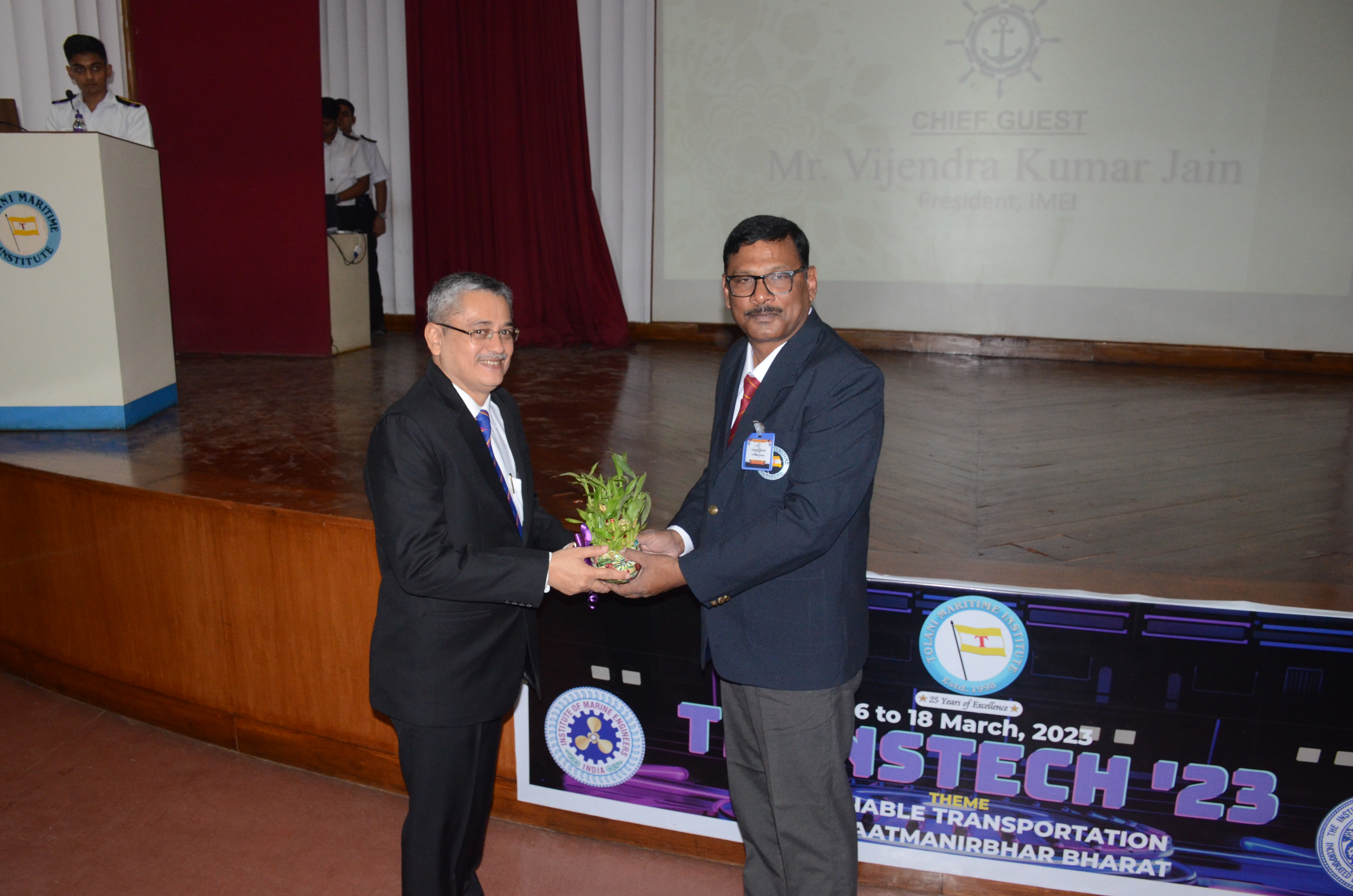 The technical carnival of Tolani Maritime Institute “TRANSTECH 2023” portraying this year's theme, ‘Sustainable Transportation: Key to Atmanirbhar Bharat’, began on 16th March 2023 with the arrival of the chief guest, the President of the Institute of Marine Engineers (IMEI), Mr. Vijendra Kumar Jain. Followed by the lamp lighting ceremony and the Vandana of goddess Saraswati.