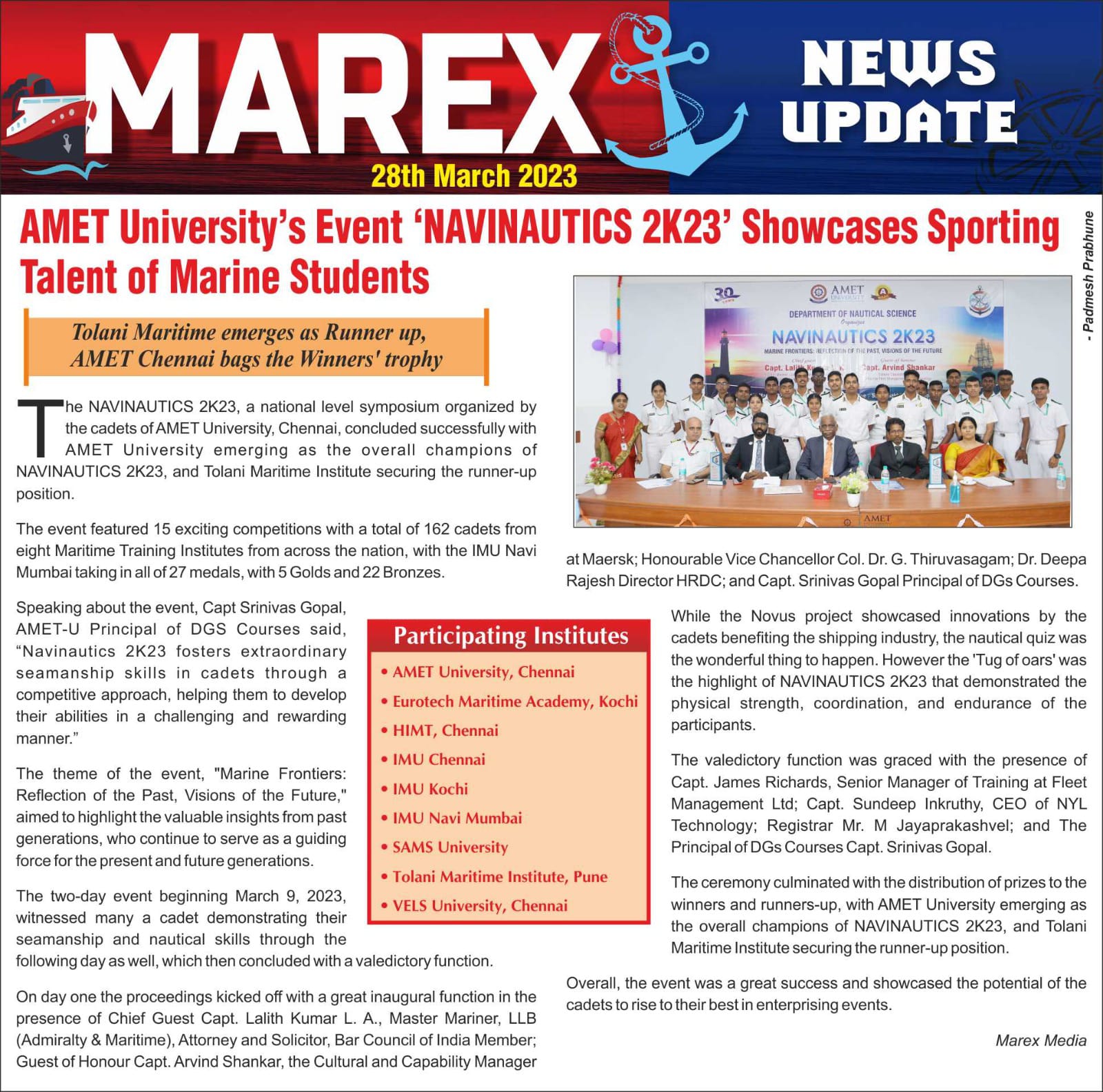 The NAVINAUTICS 2K23, a national level Symposium organized by the cadets of AMET University , Chennai, concluded successfully with AMET University emerging as the overall champions of NAVINAUTICS 2K23, and Tolani Maritime Institute securing the runner up position.