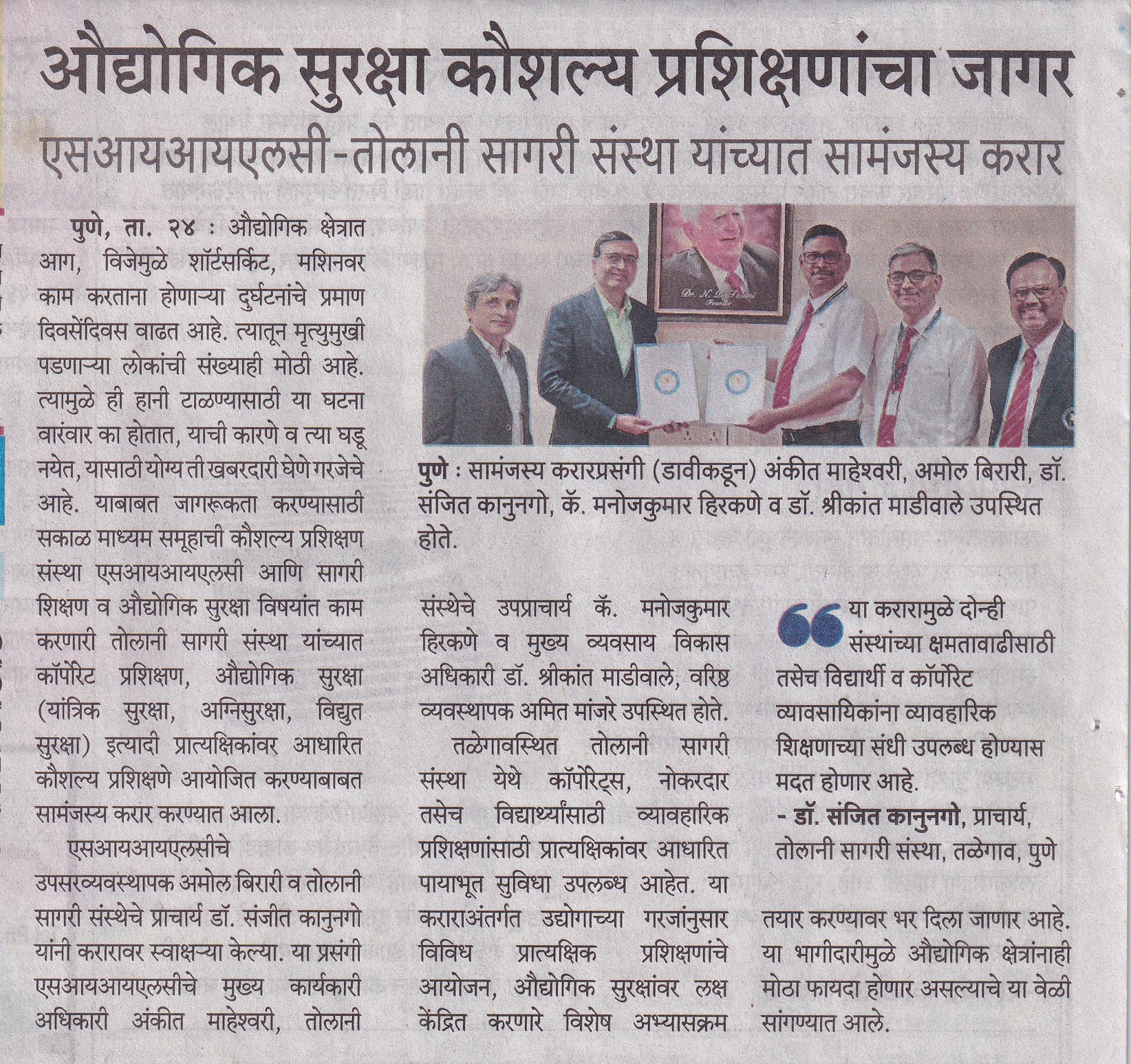 औदयोगिक सुरक्षा कौशल्या प्रशिक्षणाचा जागर : एसआयआयएलसी आणि तोलानी सागरी संस्था ह्यांच्यात सामंज्यस्य करार